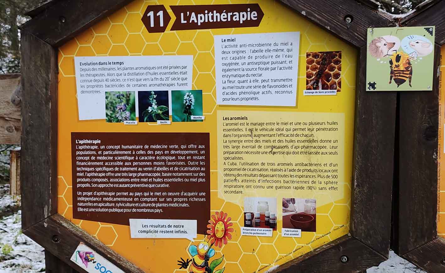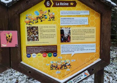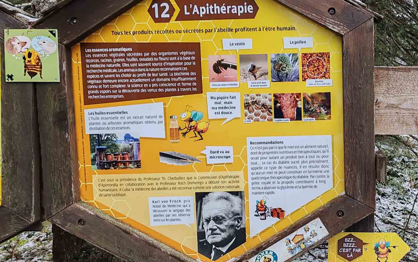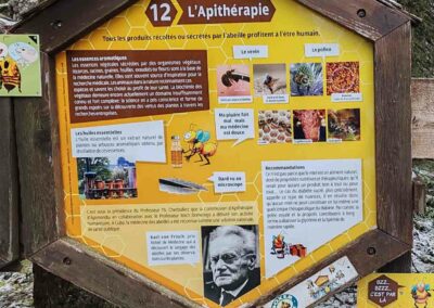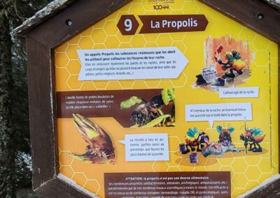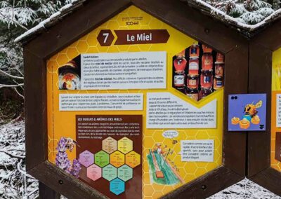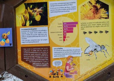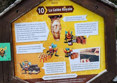 Le sentier met également en lumière le monde fascinant des abeilles : leur cycle de vie selon leur rôle au sein de la ruche, les particularités de la reine, les caractéristiques du miel, la composition du pollen ou encore l’importance de la propolis et de la gelée royale. Une approche pédagogique qui permet de découvrir les bienfaits du miel et les principes de l’apithérapie, tout en sensibilisant à l’importance de la préservation des pollinisateurs. Consultez les panneaux ci-dessous pour plus d’informations.