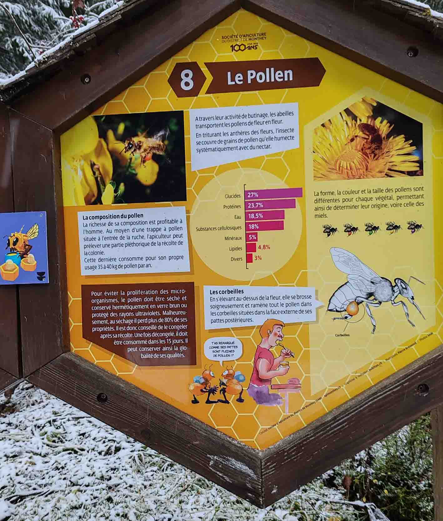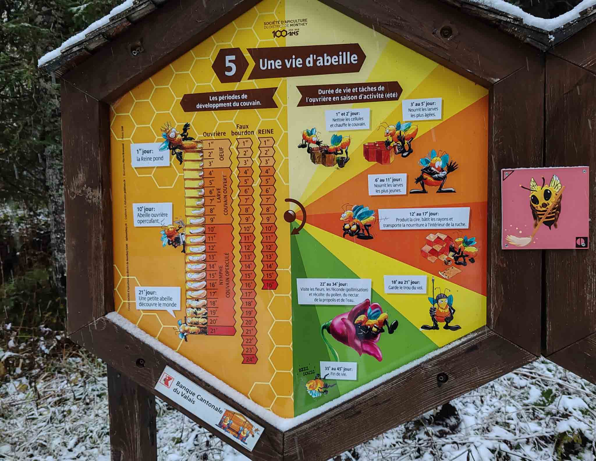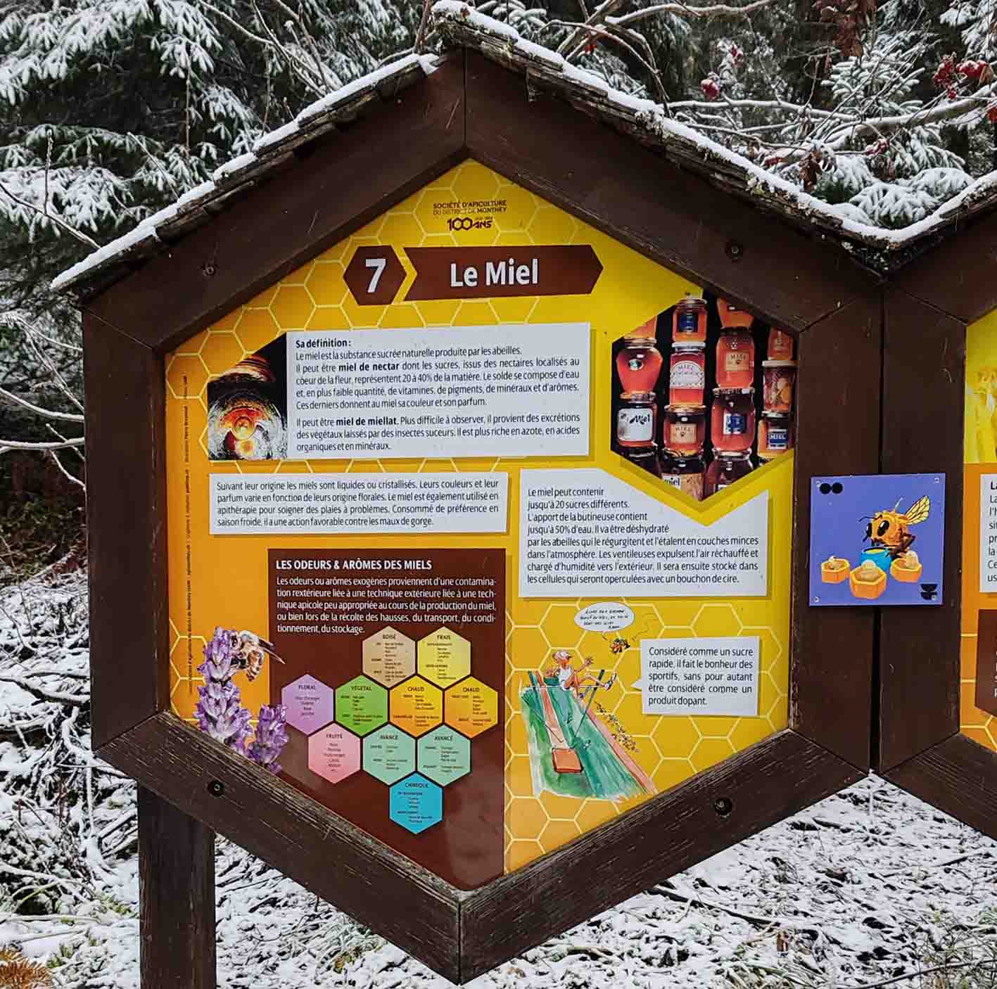 Le sentier met également en lumière le monde fascinant des abeilles : leur cycle de vie selon leur rôle au sein de la ruche, les particularités de la reine, les caractéristiques du miel, la composition du pollen ou encore l’importance de la propolis et de la gelée royale. Une approche pédagogique qui permet de découvrir les bienfaits du miel et les principes de l’apithérapie, tout en sensibilisant à l’importance de la préservation des pollinisateurs. Consultez les panneaux ci-dessous pour plus d’informations.
