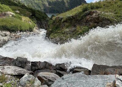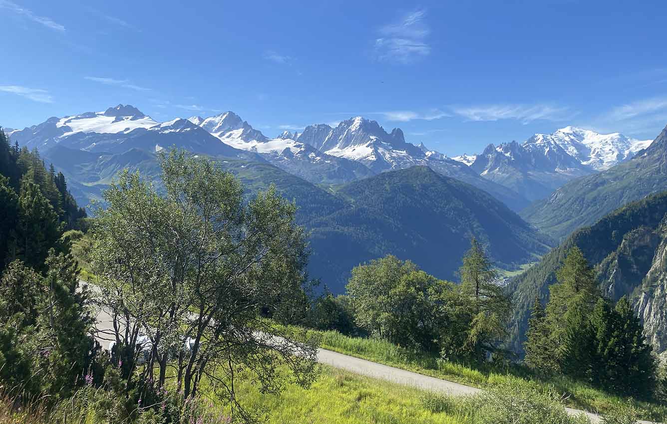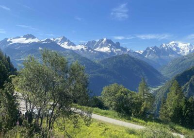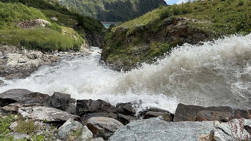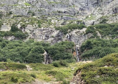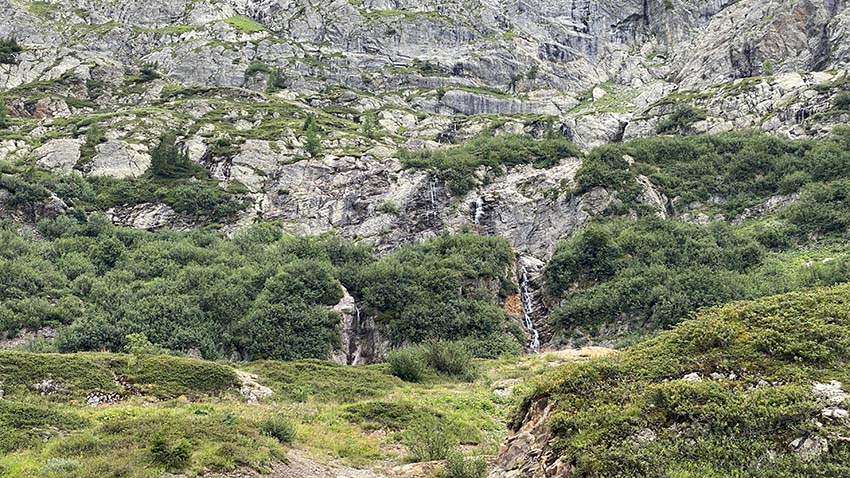 Pour le retour, je vous suggère d’emprunter le sentier qui débute à la buvette. Cela vous permettra de faire ainsi une boucle tout en découvrant un tout autre décor, plus sauvage avec une superbe vue sur le massif du Mont-Blanc. Gardez l’oeil ouvert : de magnifiques cascades jalonnent le parcours à votre droite avant de rejoindre le chemin asphalté menant au grand barrage d’Émosson.