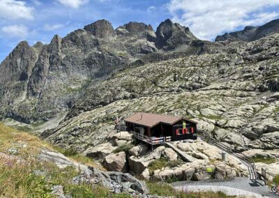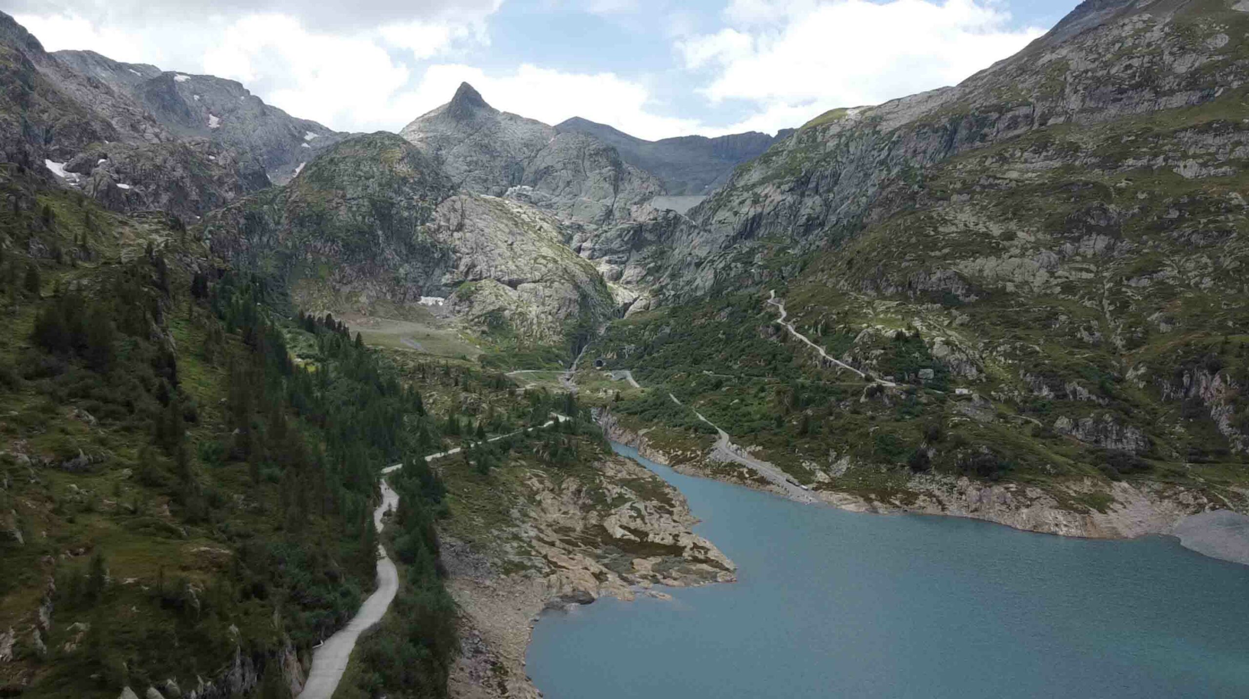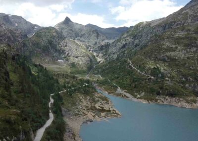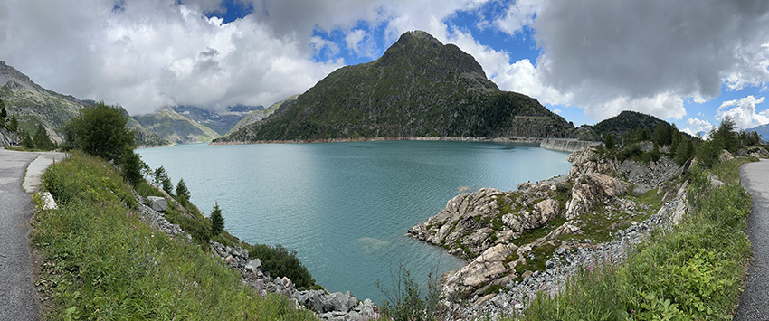 Pour l’aller, je vous conseille de suivre l’itinéraire par la route asphaltée. Vous allez longer les eaux turquoises du lac d’Émosson avant d’attaquer une montée assez raide et soutenue 😅.  En chemin, vous traverserez d’anciens tunnels de chantier, vestige des travaux liés à la construction du barrage. Ce passage insolite ajoute un petit côté aventure à cette randonnée.