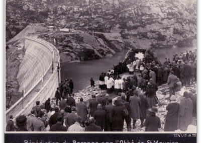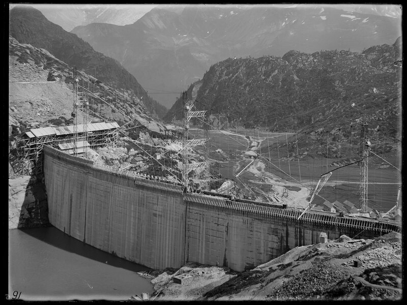 La construction du barrage d’Émosson a noyé le barrage de Barberine sous les eaux du lac d’Émosson. L’ancien barrage apparaît lorsque le niveau du réservoir est bas au début de l’été.